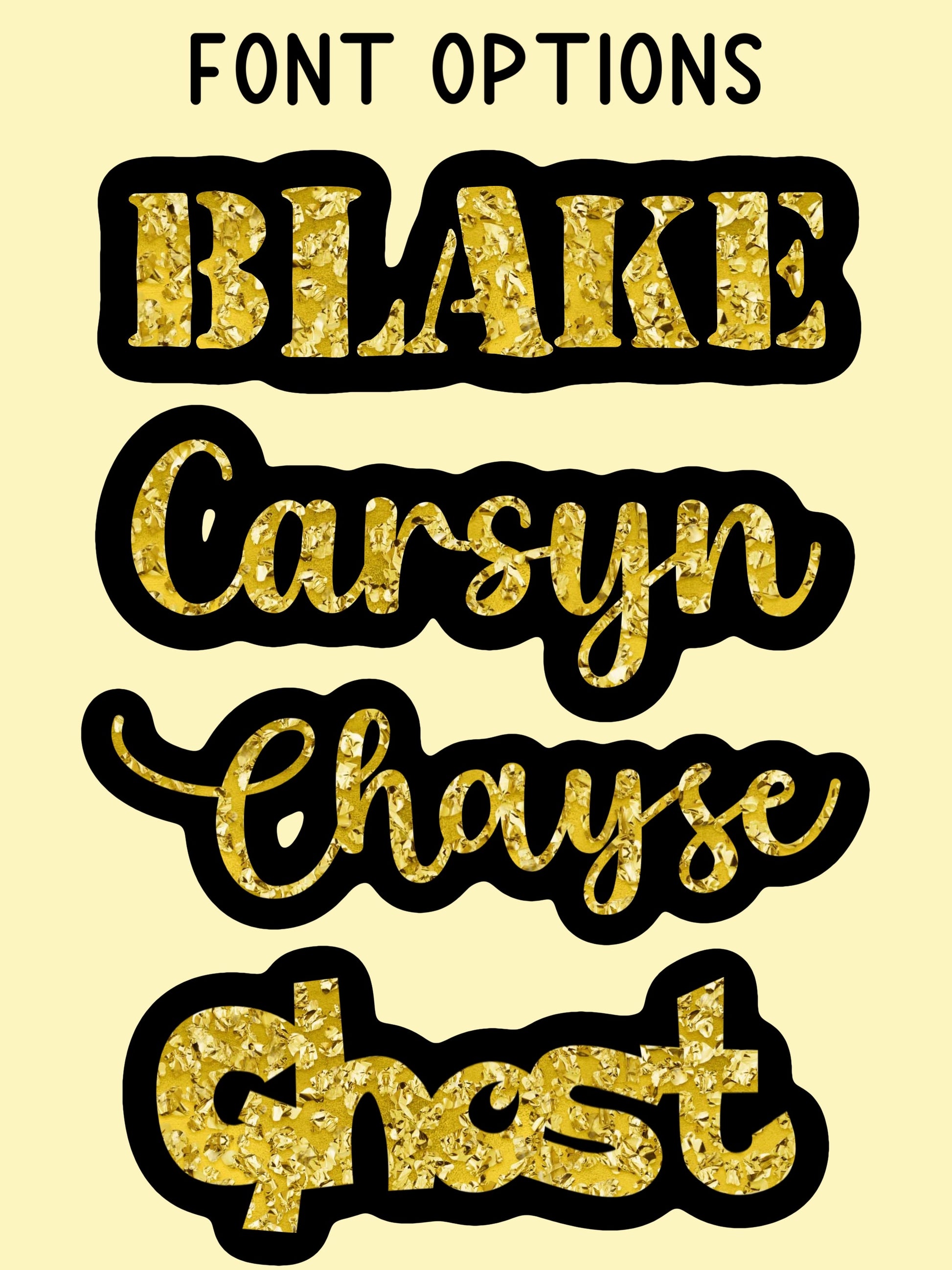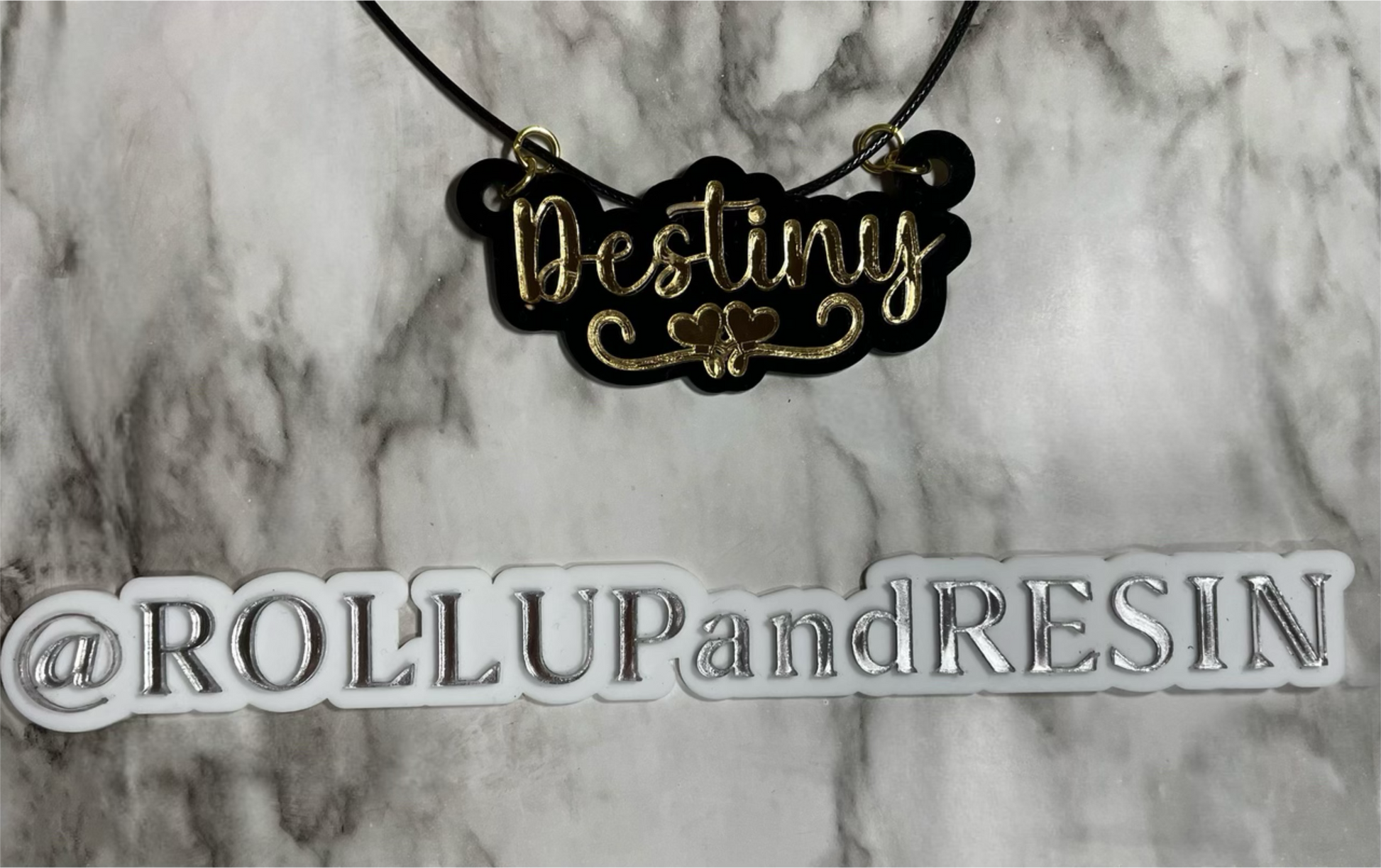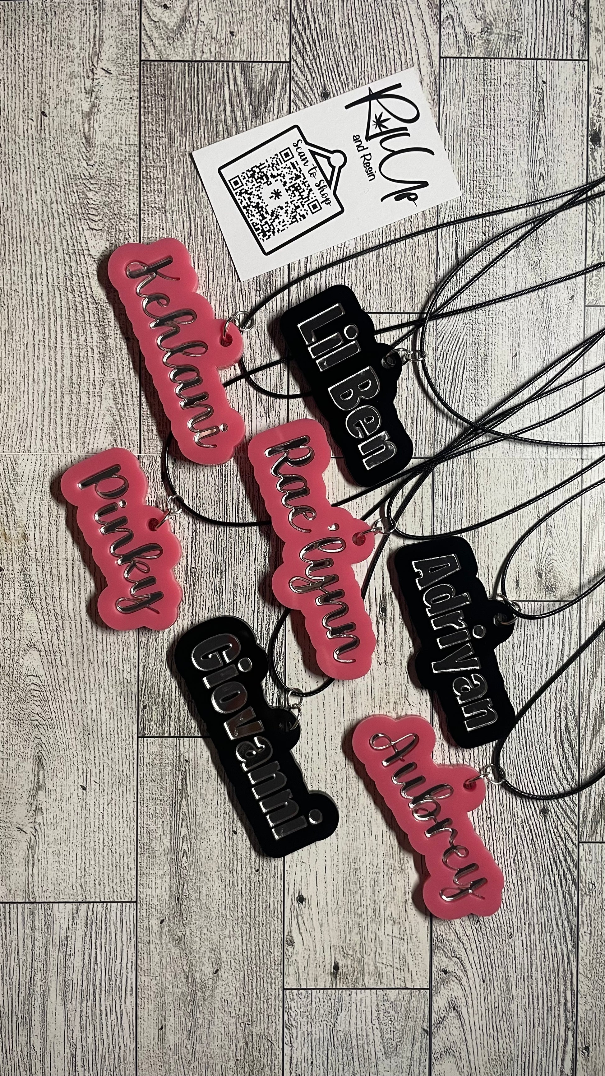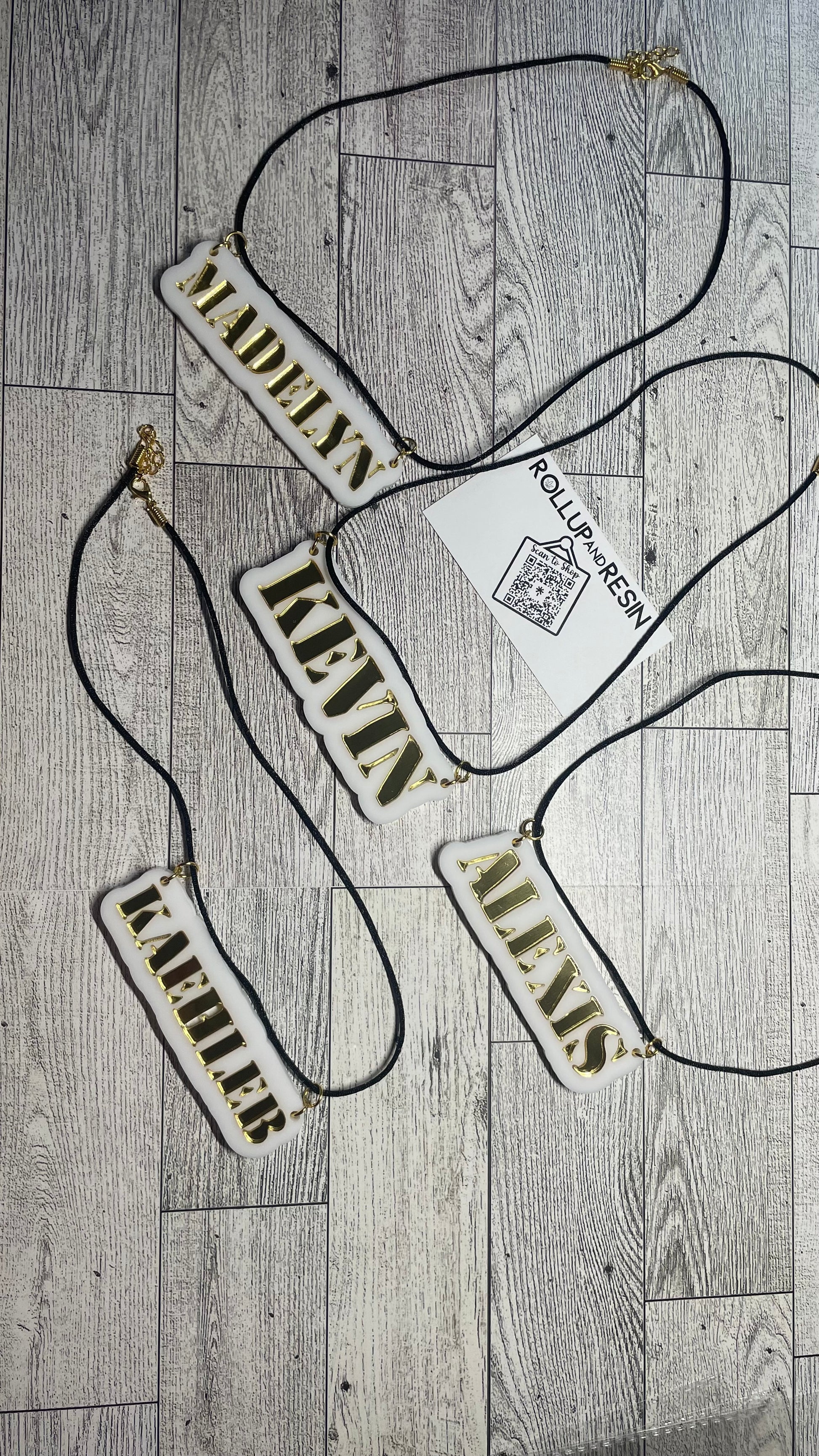 These acrylic name plates come in 2-4” in width depending on name size/font style. Comes with a black rope chain with gold or silver accents to match charm color.