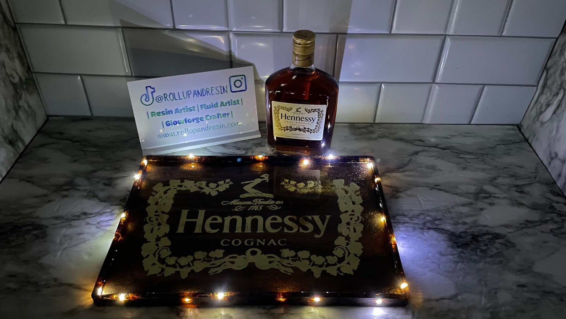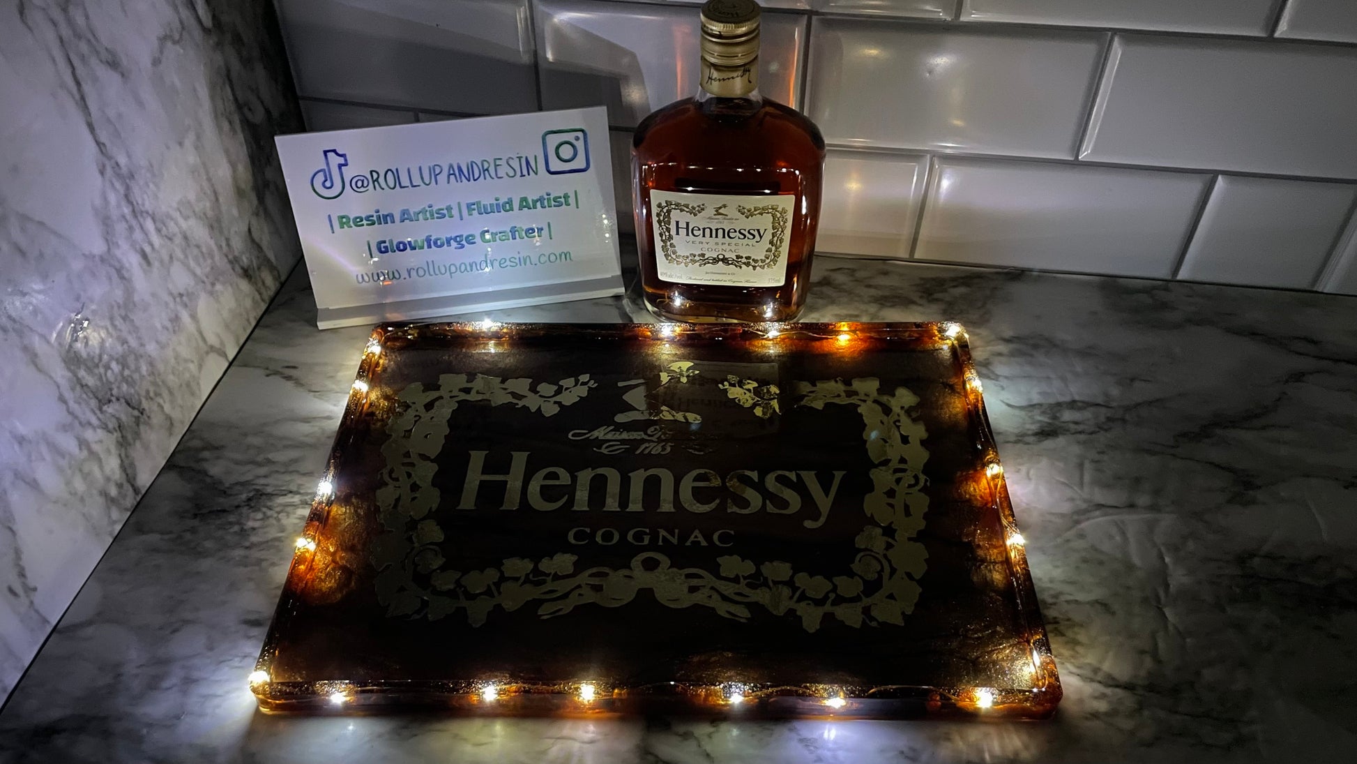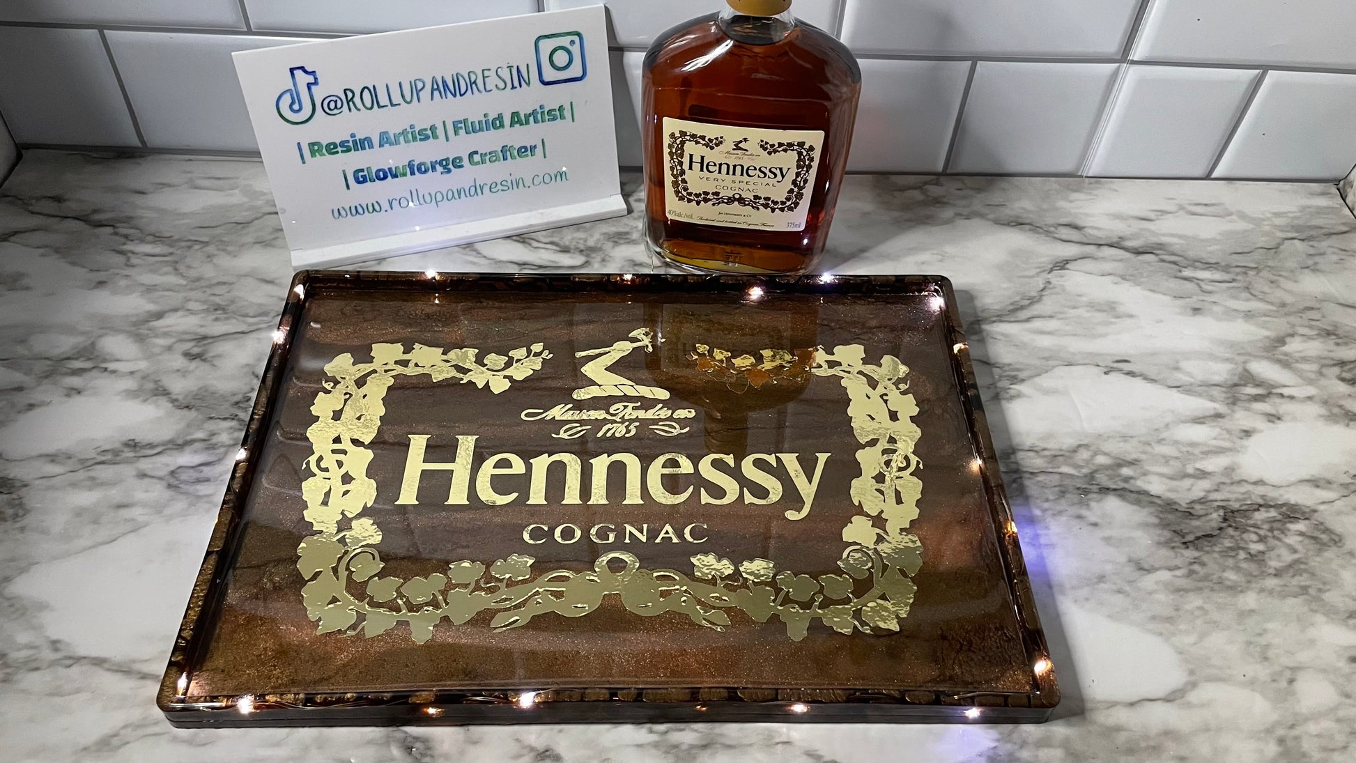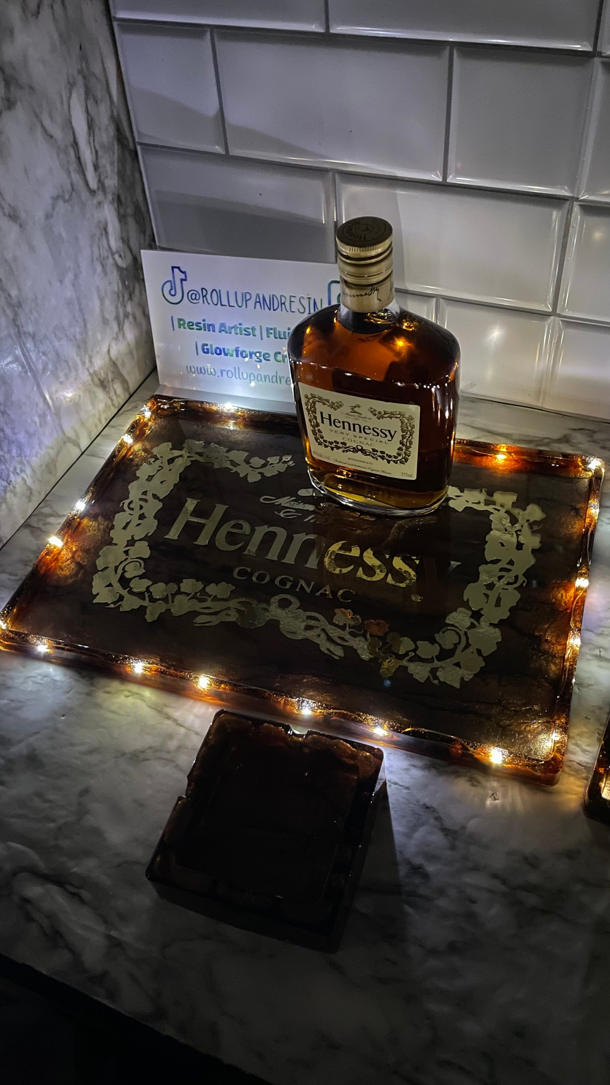 13x9 wood grain inspired henny tray with gold leaf lettering and led lights. Comes with complementary ashtray. Bottle not included