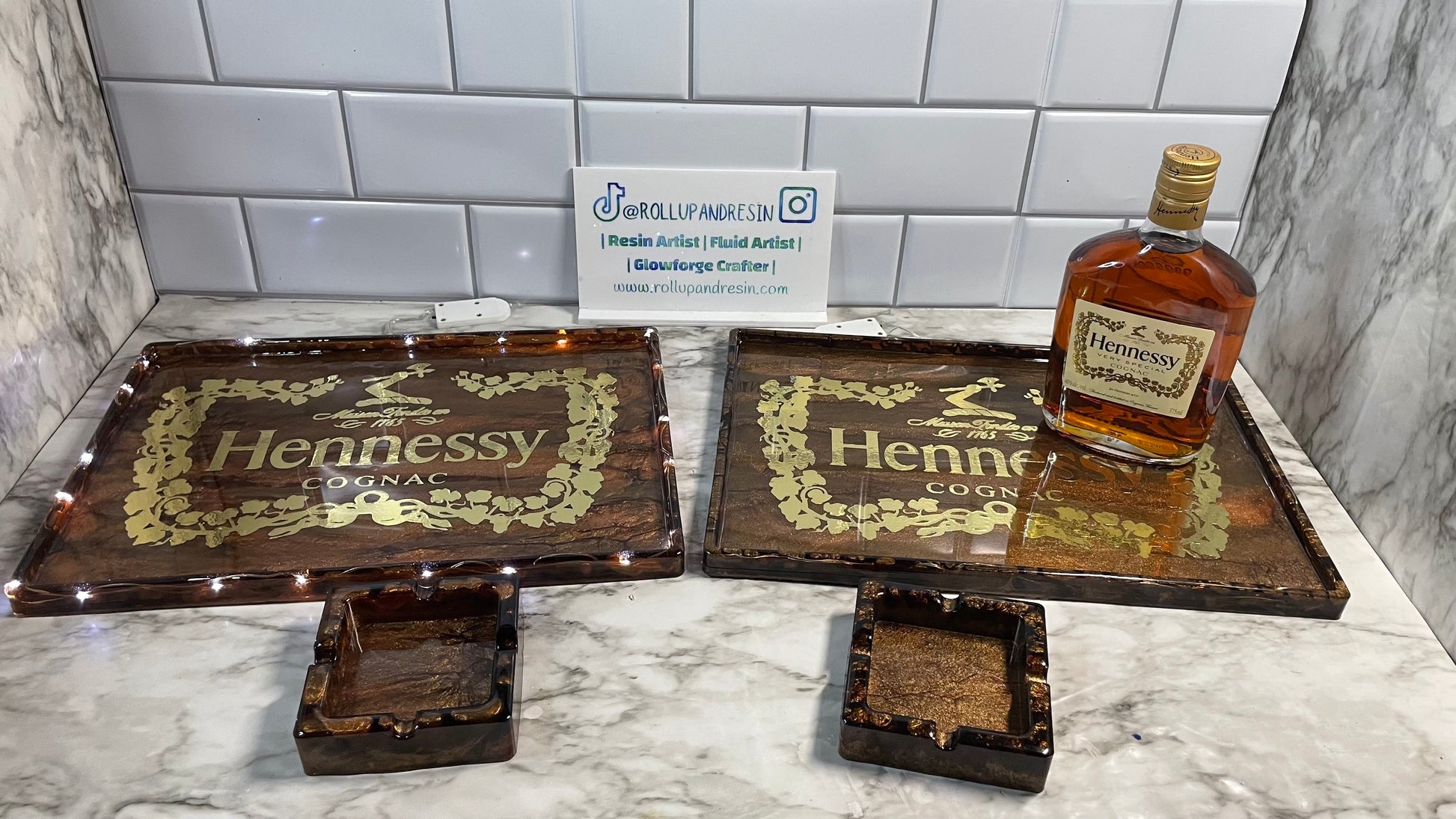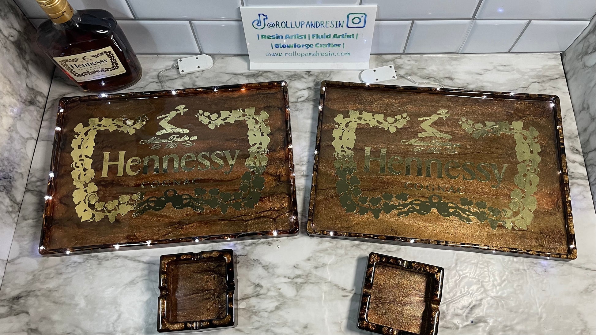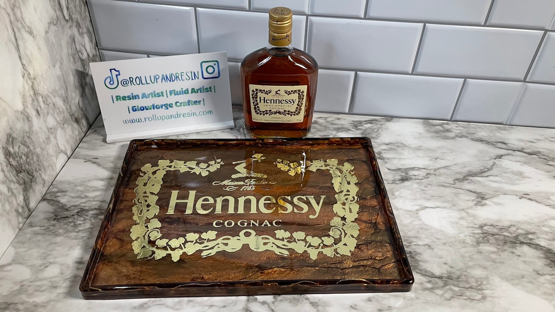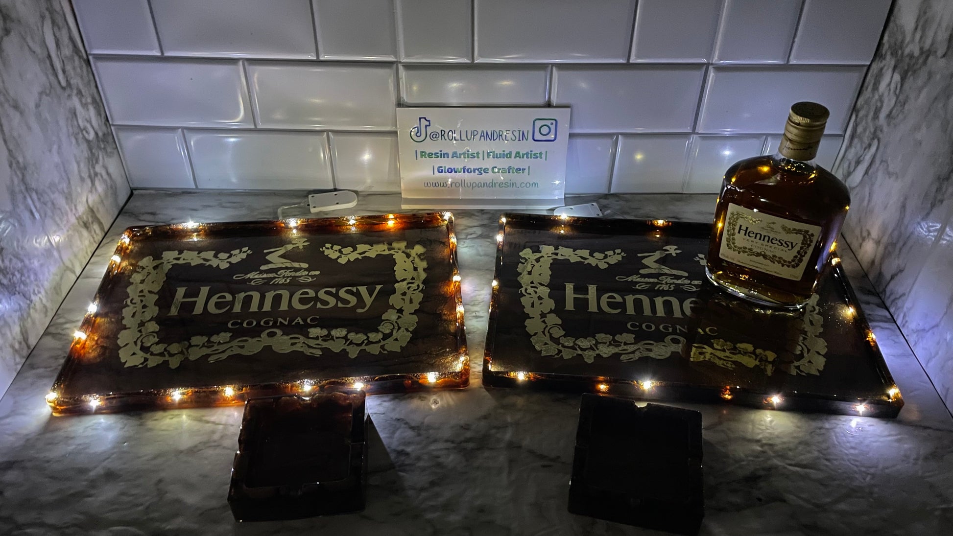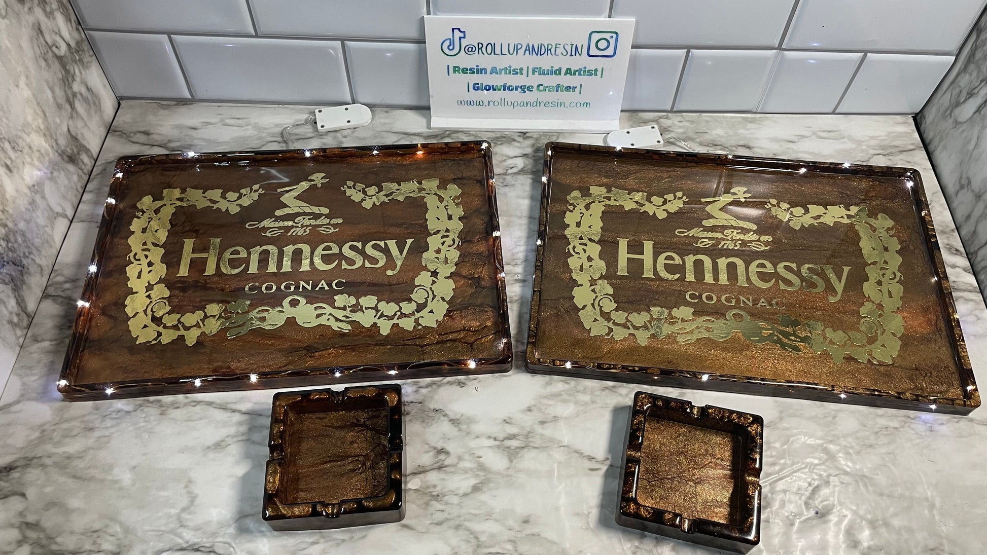 13x9 wood grain inspired henny tray with gold leaf lettering and led lights. Comes with complementary ashtray. Bottle not included