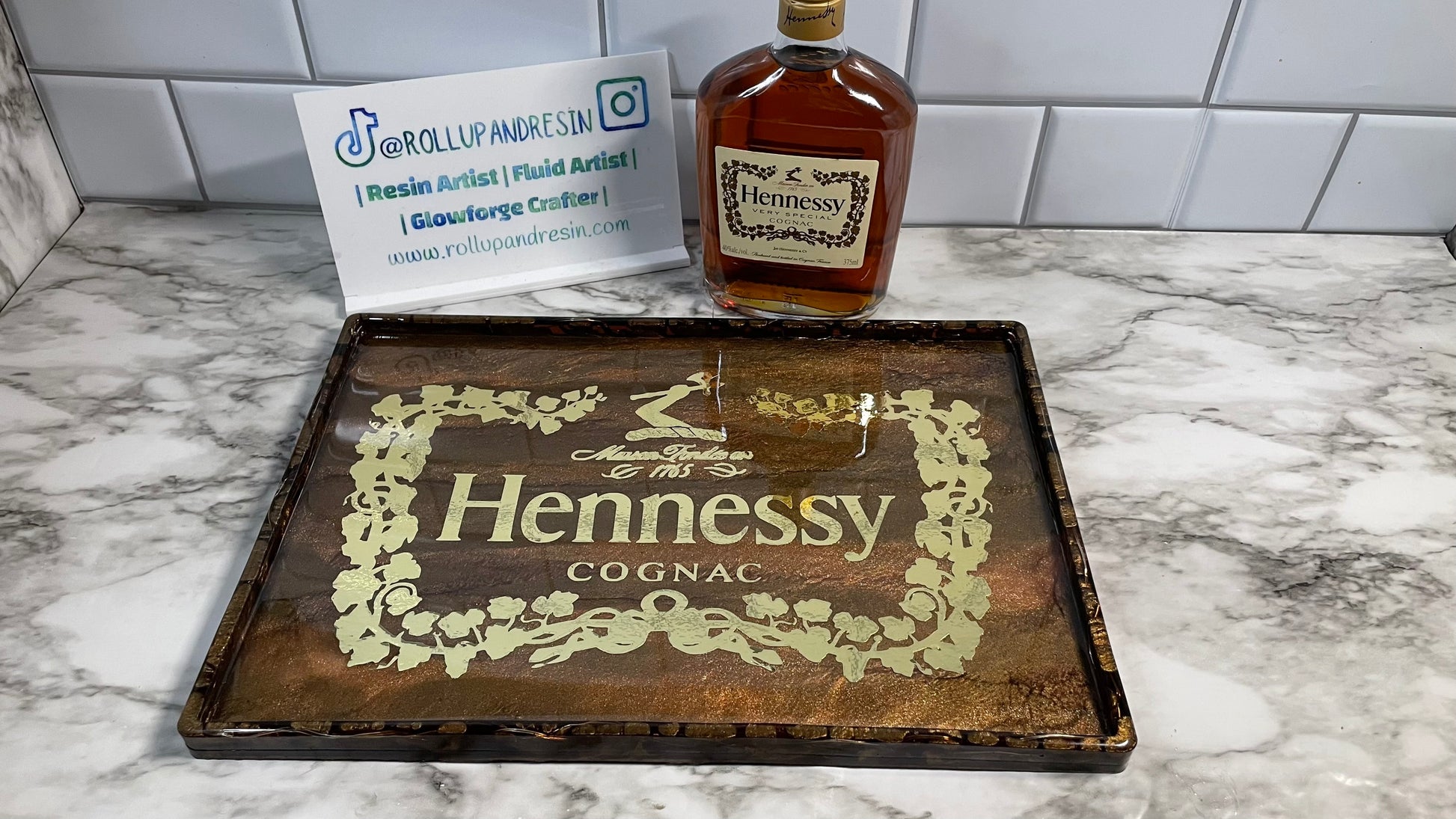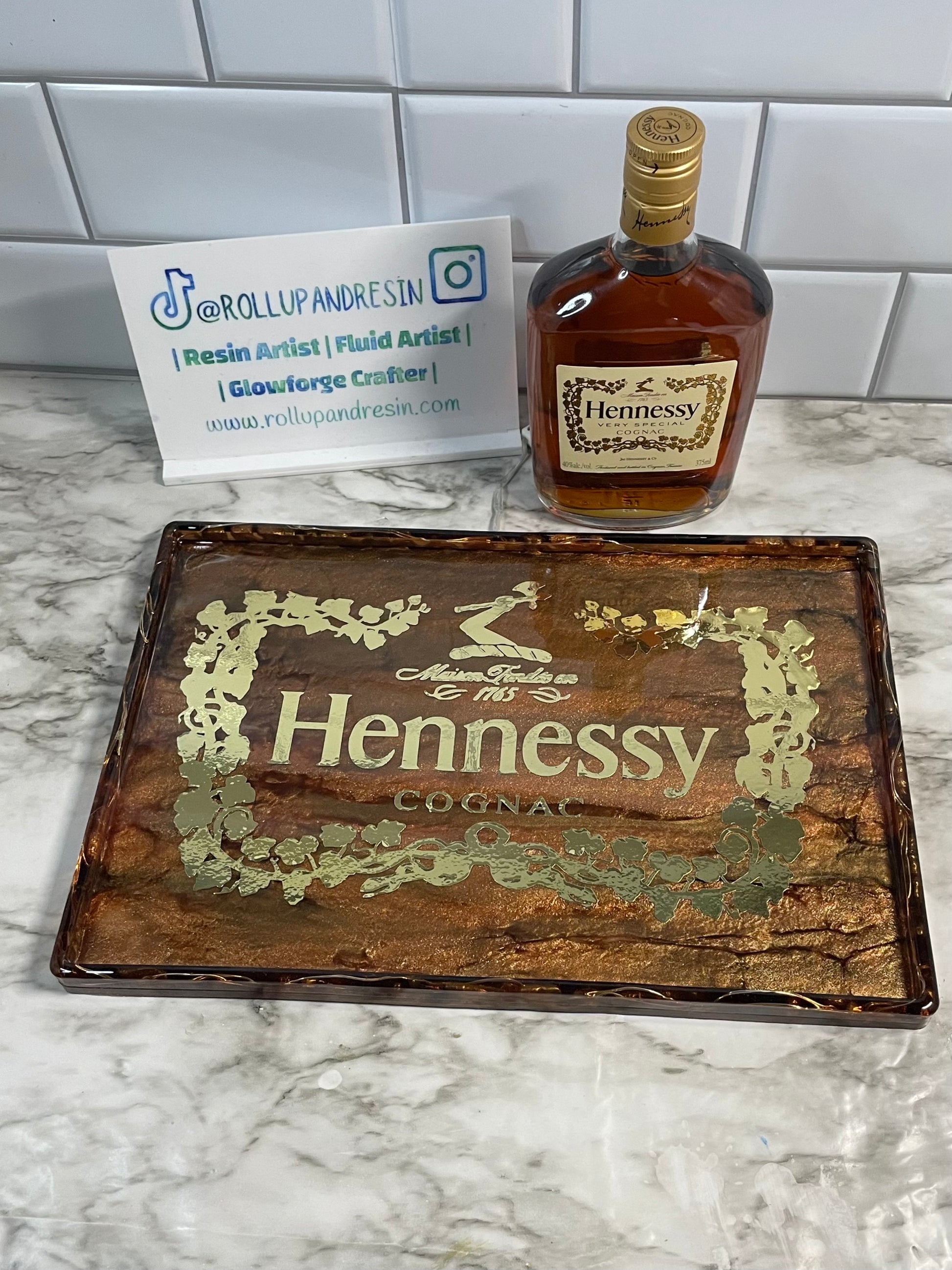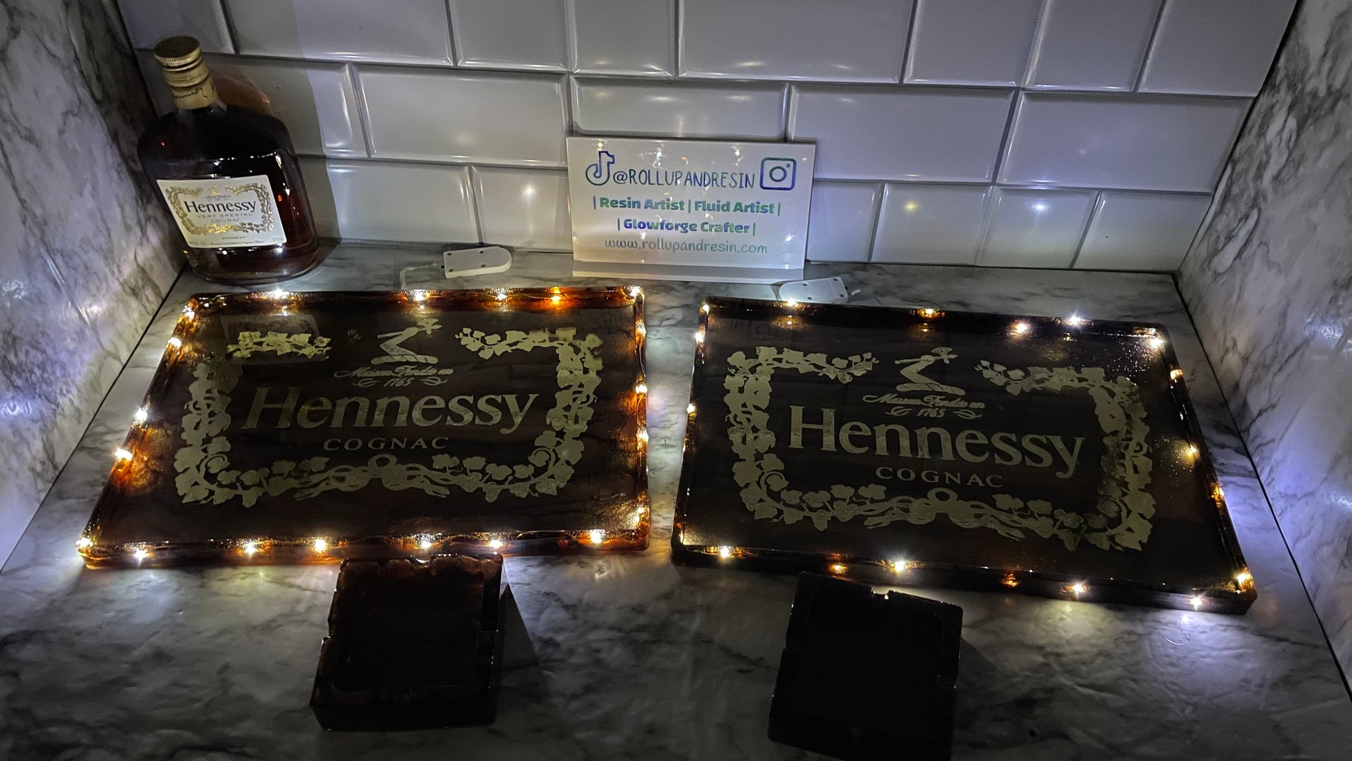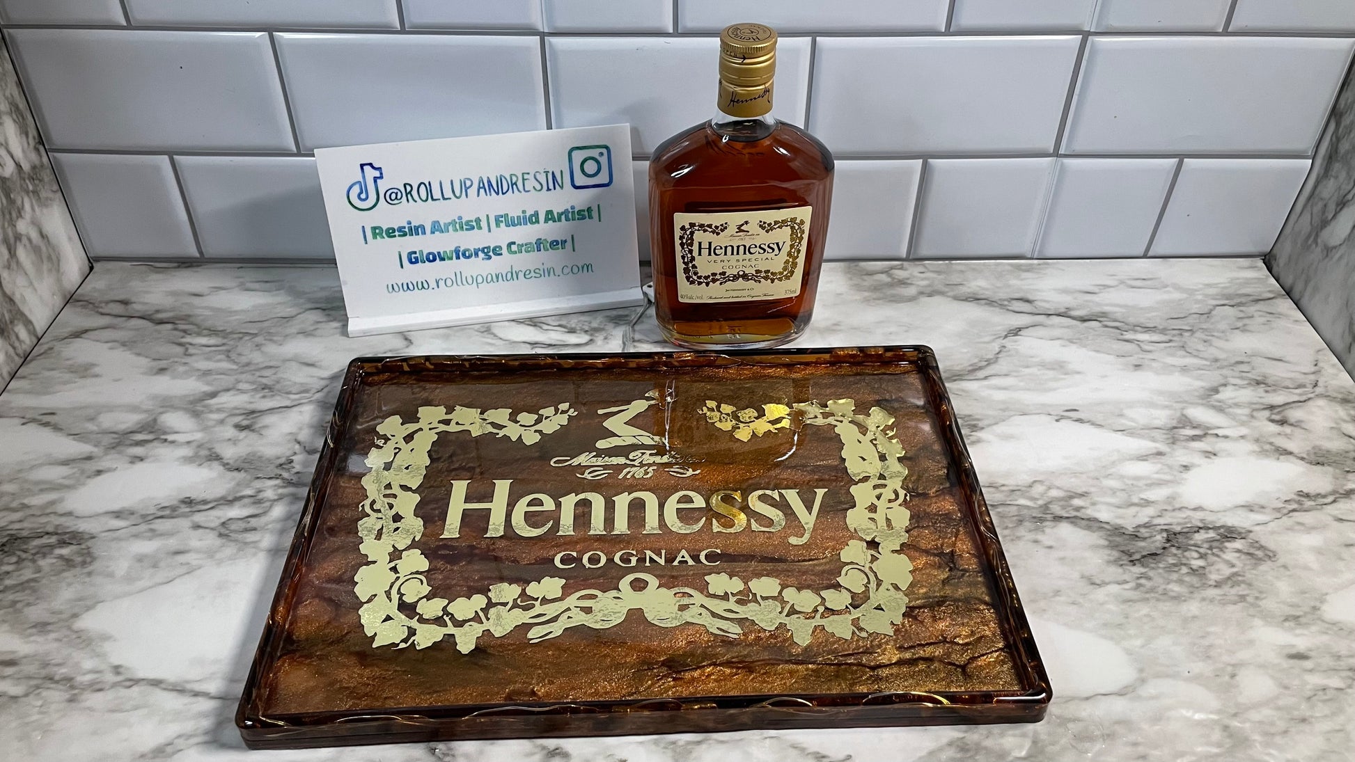 13x9 wood grain inspired henny tray with gold leaf lettering and led lights. Comes with complementary ashtray. Bottle not included